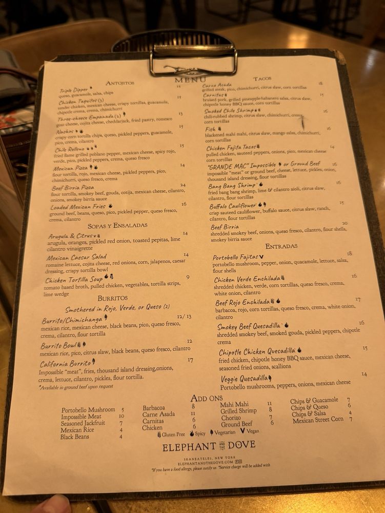 Welcome to Elephant And The Dove, a charming Mexican eatery tucked away in Skaneateles, NY. This quaint spot is all about vibrant flavors and a warm atmosphere. Here, you'll find a delightful array of authentic dishes, from mouthwatering tacos to crispy nachos and delectable taquitos that have garnered rave reviews.